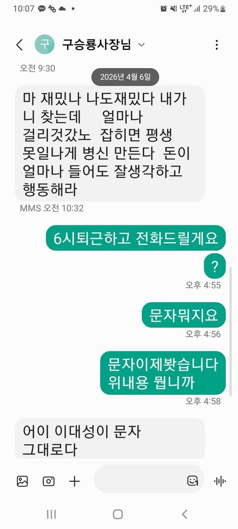 돈100만원을 빌려놓고 며칠지난뒤 전화 2통 안받앗다고 마 재미잇나 나도 재미잇다 너 찾는데 얼마나 걸리겟노 못 일어나게 병신 만든다 돈이 얼마나 들어도 니 찾는데 시간 문제다 잘생각하고 행동해라 이런 문자를 받앗습니다..그리고 문자 보내신분은 음주로인한 집행유예 기간입니다..