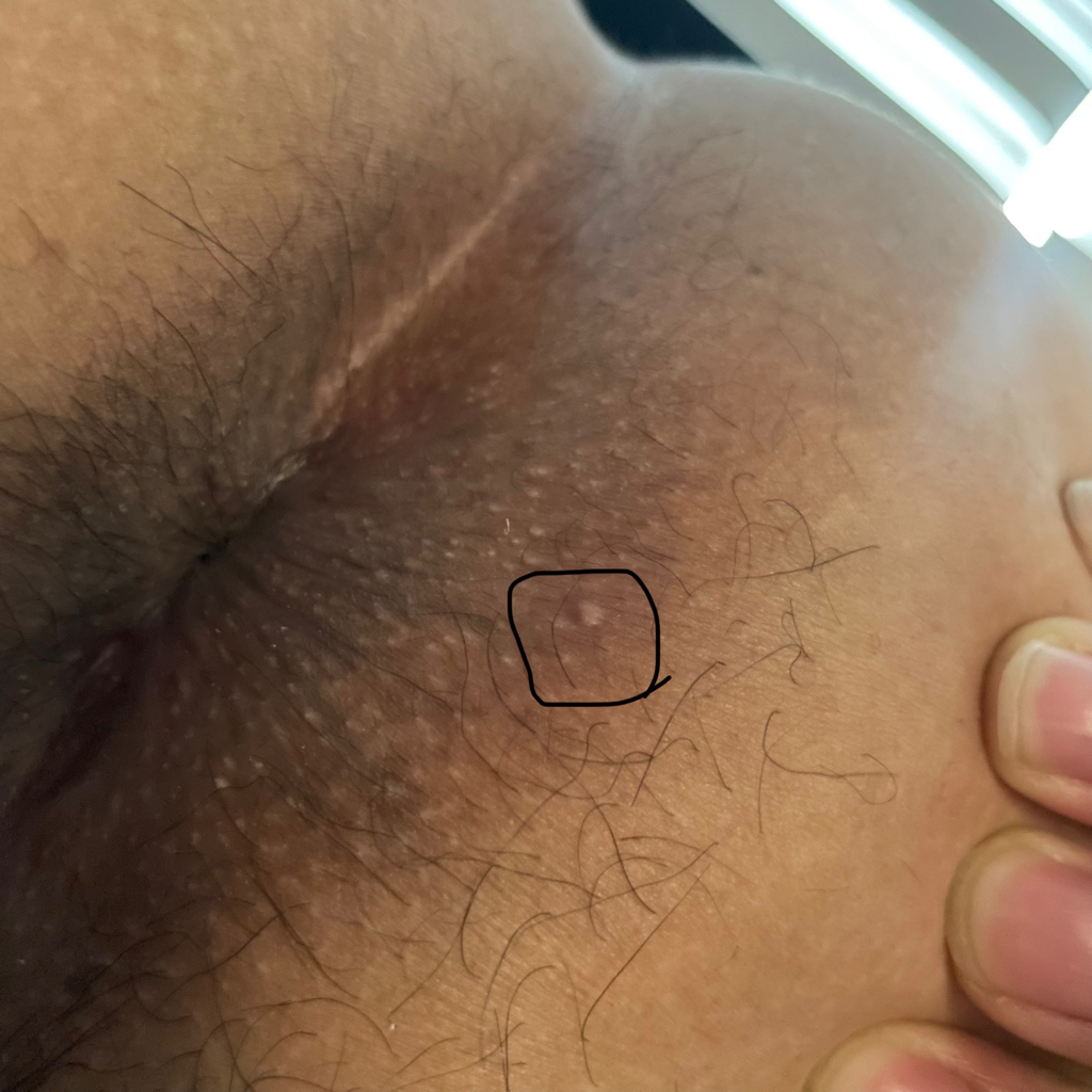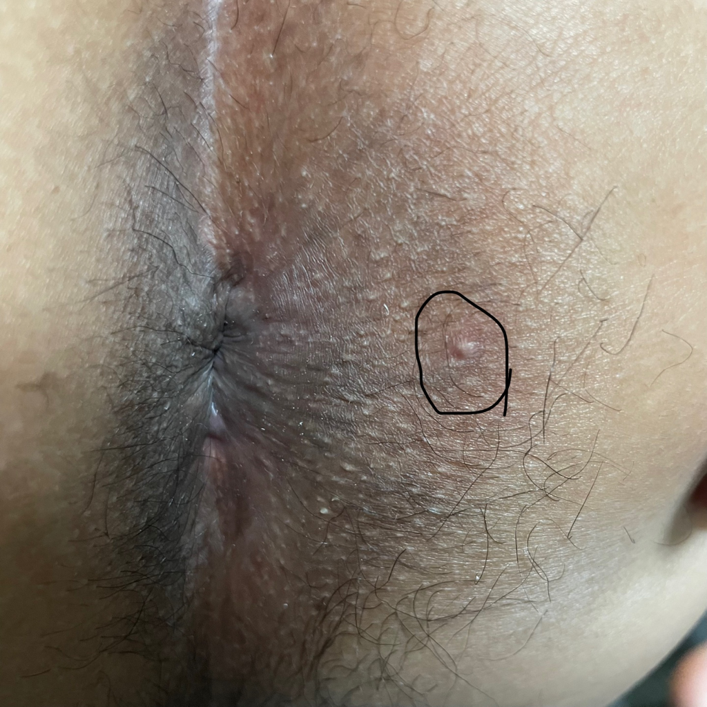 사진을 보니 항문 주위에 혹 같은 것이 있는 것 같습니다. 항문곤지름의 경우, 닭벼슬 모양의 사마귀가 주로 발생하며, 크기는 다양합니다. 또한, 항문곤지름은 피부에 닿으면 쉽게 전염될 수 있으므로, 다른 사람과 접촉을 피하는 것이 좋습니다.