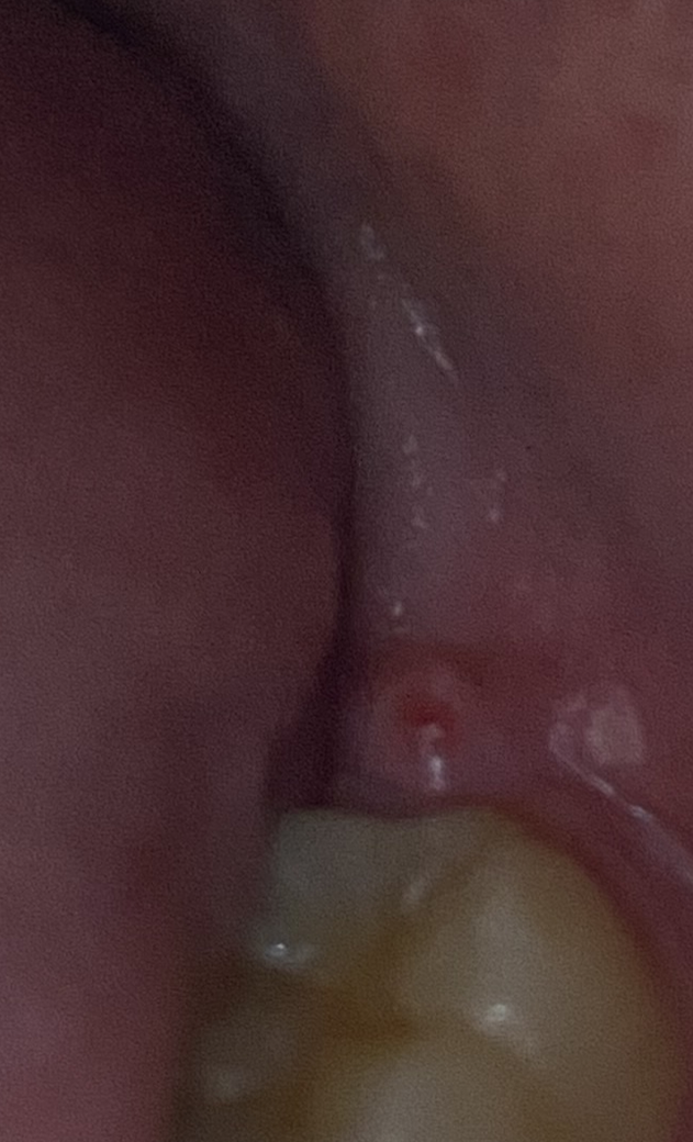 사진이 어둡고 초점이 정확하게 맞지 않아서 정확하게 말씀드리기 어렵지만, 잇몸에 염증이 생겼거나 혈종이 생겼거나 구내염이 생겼거나 등의 상황일 수 있습니다. 심각한 상황은 않아보이지만 계속 아프거나 나아지지 않으면 치과가서 검진 받아보시는게 좋을거 같습니다. 감사합니다.