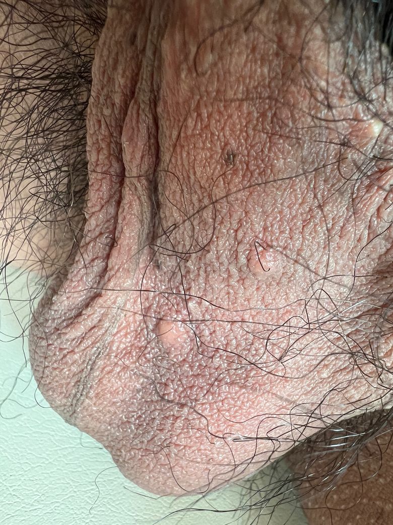 사진상 병변은 음낭 피부에 국한된 작은 피부색 구진들이며, 일부는 중앙이 약간 함몰된 형태로 보입니다. 표면이 매끈하고 염증성 홍반이나 진물은 관찰되지 않습니다. 임상 양상으로 보아 전염성 연속종(molluscum contagiosum) 가능성이 가장 우선적으로 고려됩니다. 이는 성인에서 성접촉을 통해 전파되는 경우가 흔하며, 수 밀리미터 크기의 돔 모양 구진과 중심 함몰이 특징입니다.
