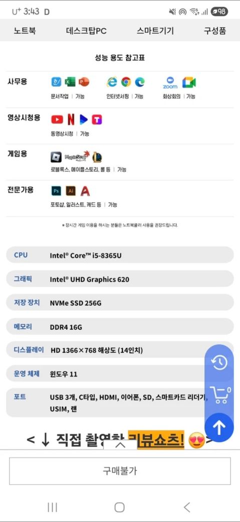 중고 노트북 사려는데 하려는 게임이 있습니다