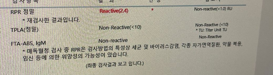 병원에서 혈당을 잴 때 살짝 스쳐서 피가 난 상황이 걱정되실 수 있습니다. 사진에 보이는 검사 결과 중 RPR 검사가 "Reactive (2.4)"로 나타났지만, 이는 위양성일 가능성이 있습니다. RPR 검사는 매독을 진단하기 위한 검사로, 다른 상태나 질환, 약물 복용 등에 의해 위양성 반응이 나올 수 있습니다. 이를 확인하기 위해 추가 검사로 TPPA(정밀) 및 FTA-ABS IgM 검사를 시행할 수 있습니다. TPPA는 매독균에 대한 특이 항체를 확인하는 검사로, 음성으로 나왔기 때문에 매독에 걸리지 않았을 가능성이 높습니다. 또한 FTA-ABS IgM 검사도 비활성화 상태로 나왔습니다.