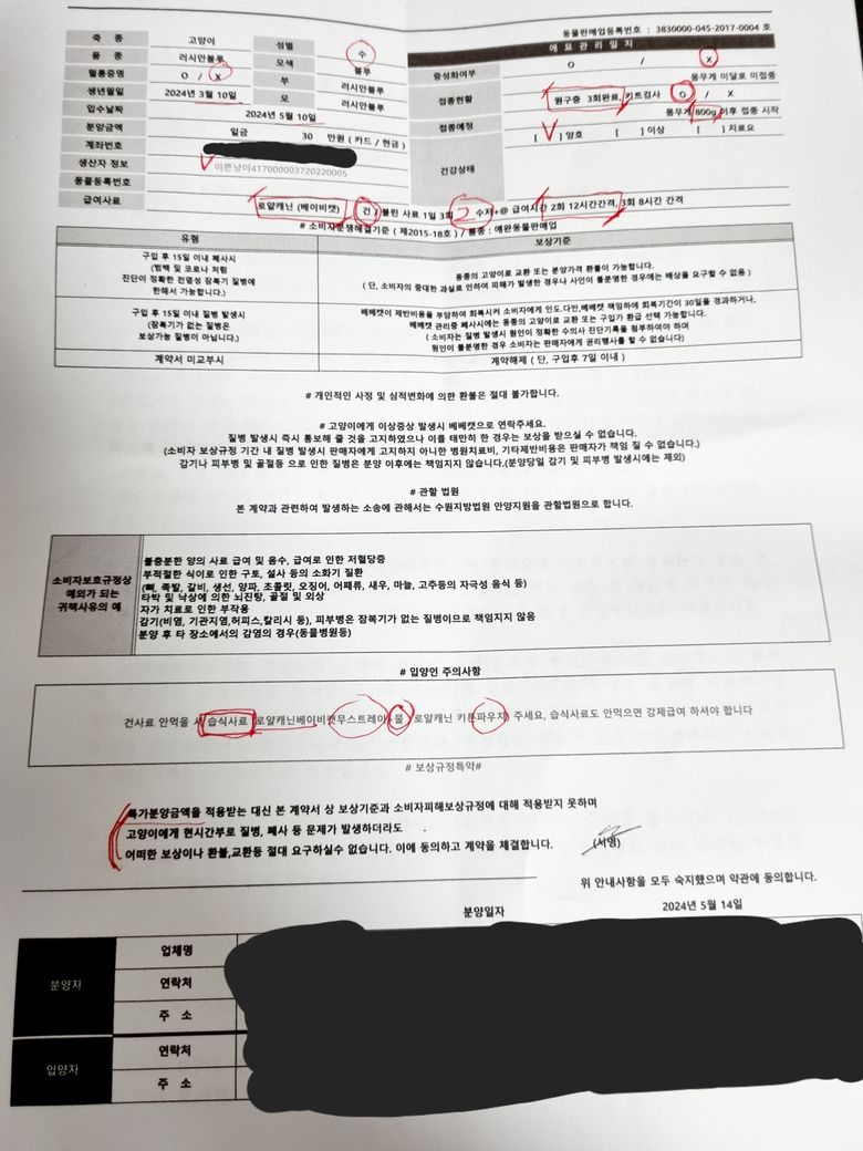 (특가분양금액을 적용받는 대신 본 계약서 상 보상기준과 소비자피해보상규정에 대해 적용받지 못하며 고양이에게 현시간부로 질병,폐사 등 문제가 발생하더라도 어떠한 보상이나 환불,교환 등 절대 요구할 수 없습니다.)