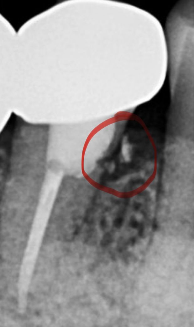 신경치료 후 엑스레이 사진 상에서 보이기로는 부골이 아닐까 싶습니다. 특별히 증상이 없다면 그냥 정기적으로 체크하면서 관찰하면 됩니다.