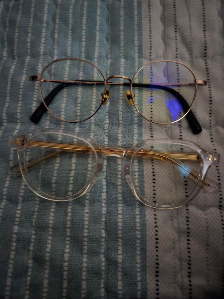 요즘 트렌드에 더 맞는것은 아래쪽 투명테 라인으로 보입니다. 위 디자인은 김구 안경이라고 놀리기도 하는 안경으로 트렌디 해보이지는 않습니다. 색감이나 재질의 조합들도 아래쪽이 더 괜찮아 보여서 추천드립니다.