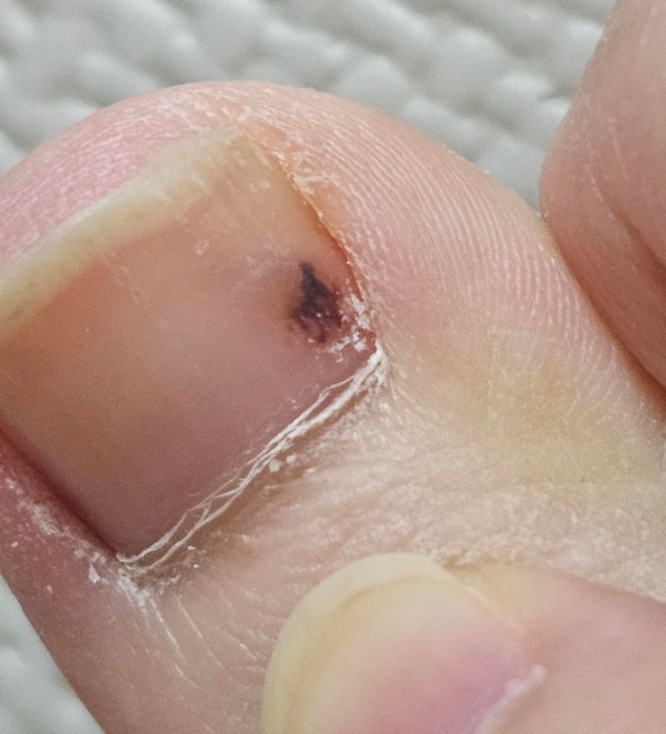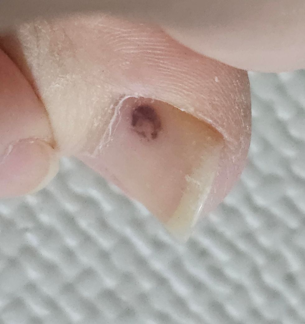 양쪽 엄지 발톱에 하나씩 사진과 같은 검정 색깔 점 같은게 생겼는데 이거 혹시 흑색종일까요?ㅠㅜ 병원을 가봐야하는건지 모르겠어요ㅠㅜㅜ