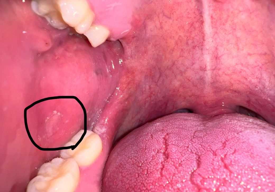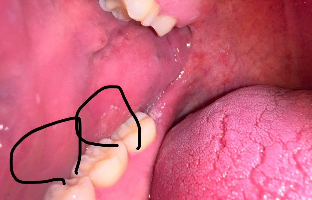몇일전에 찢어졌던 상쳐를 제가 손으로 만져서 살이 더 까졌거든요 선생님들 혹시 상처가 아무는 괴정일까요 아니면 구강암 병변 뭐 이런걸까요 너무 걱정되서 여쭙습니다 혹시 동그라미 친 부분 구강암 병변일지 걱정되서 이렇게 여쭤봅니다 그리고 동그란병변 옆에 얼룩같은 지도모양 저거는 왜 저런지도 궁금해서 답변 부탁드리겠습니다 ㅜㅜ