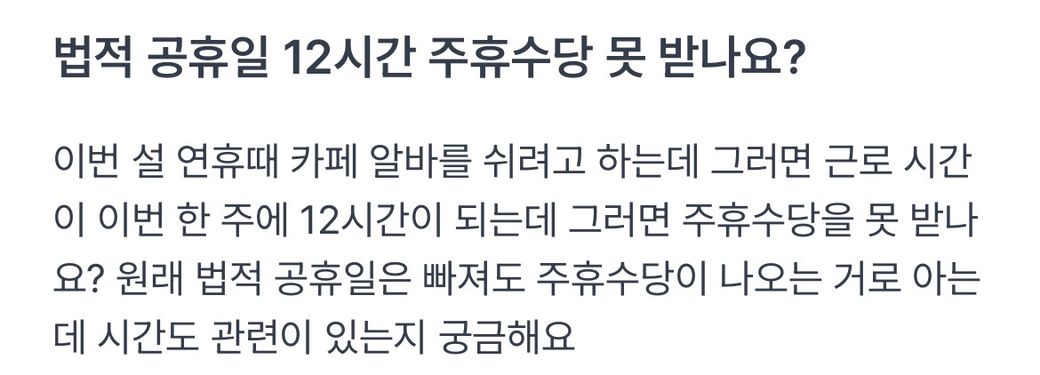 관련해서 궁금한게 있는데요, 만약 같은 경우에 5인 미만 사업장이고 설 연휴(법적공휴일)에 가게가 운영을 하지만 제가 빠지는 경우엔 주휴수당을 못 받나요? 동일하게 12시간 근무한 경우이며, 가게는 휴무가 아니지만 법적 공휴일이라 제가 쉬는 경우입니다! 법적공휴일에 가게가 운영하는데 제가 쉬면 개근이 아니게 되는건가요?