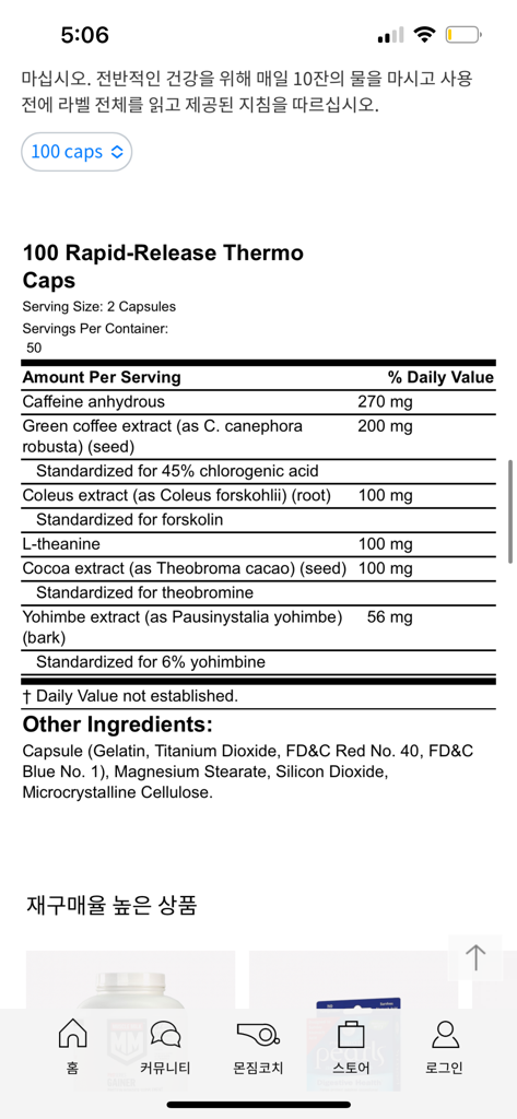 제가 먹으려하는 보충제의 영양성분입니다. 2알에 카페인 270mg 함유돼있는데 처음에는 1,2알로 시작하여 3일 후부터는 하루 총 4알로 늘려서 3주 복용 후 1주일 휴지기 하는 형식으로 섭취하는 보충제입니다.