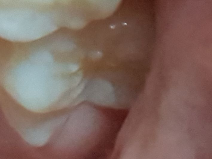 사진상으로는 잘 보이지가 않습니다만 하얗게 탈회가 되었다면 충치로 진행될 가능성이 있습니다.