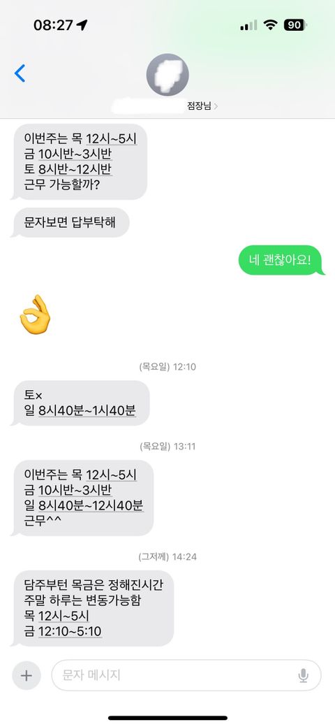 계약서에 작성한 시간과 요일은 단 하나도 맞지 않아요 근무 시간이 매일 바뀌어요 이것때문에 그만두고싶은 것도 있어요