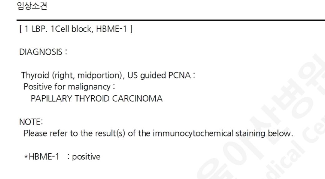 올려주신 결과지에 따르면 갑상선 세침검사결과는 갑상선 유두암에 해당되며 갑상선암 중에서 가장 흔한 종류로써, 전체 갑상선암 중 70% 정도를 차지하며 비교적 잘 치료되며 예후도 좋은 것으로 알려져 있습니다.