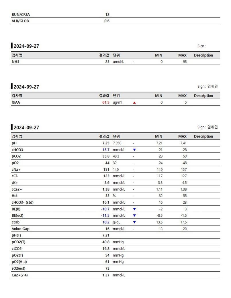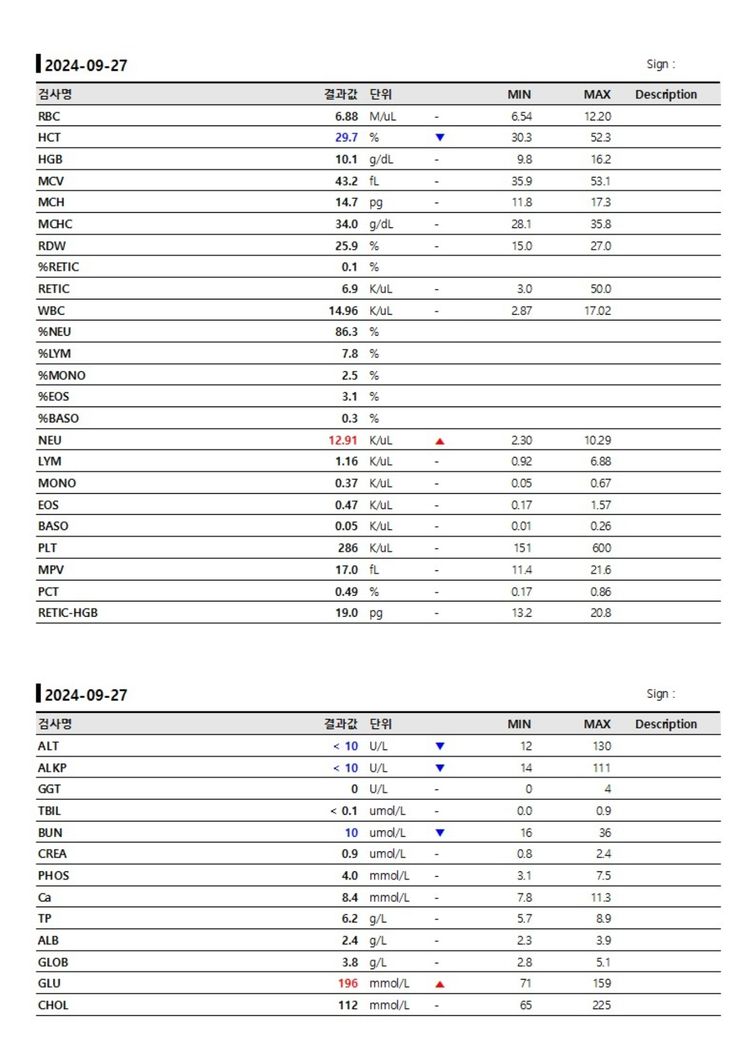 검사지는 예전에 발 붓고 잘 못걷고 식욕 없고 활동량 없어져서 찍었을 때입니다. 그 때도 발 부었었는데, 지금은 밥도 잘 먹고 걷기도 잘 걸어답니다.