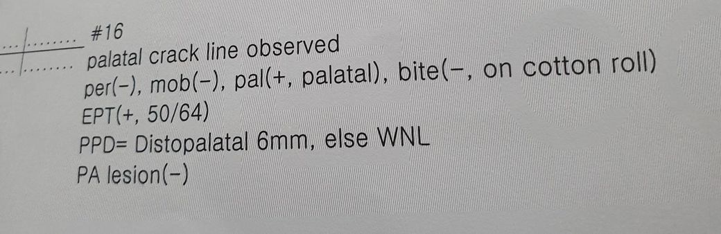 바이트도 정상이므로 크랙이 있긴 하나 깊진 않은 것입니다 강하게 치아 타진을 했다고 하셨는데 이로인한 미약한 치아 진탕의 상태로 불편한 증상이 있을 수 있습니다 1~2주 기다려보시죠