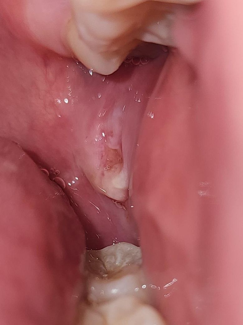 사진으로 봤을 경우에는 구강 점막이 손상이 된 상태에서 생긴 것으로 보입니다. 구강 점막의 청산은 음식을 너무 빠르게 먹거나 강하게 먹을 때 씹히면서 생기기 때문에 음식을 천천히 약하게 먹는 것이 도움이 될 수 있습니다.
