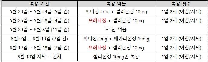 셀리온정10mg 1일 2회씩 복용중 (프레나정도 1일2회 먹다가 6/18일까지 먹고 끊음)