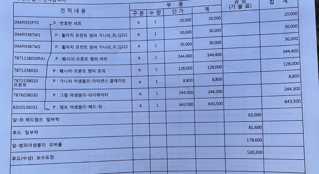 마지막 사진은 사고차량 브랜드자동차제조사업소에 갔을 때 견적서를 받은 내역입니다.