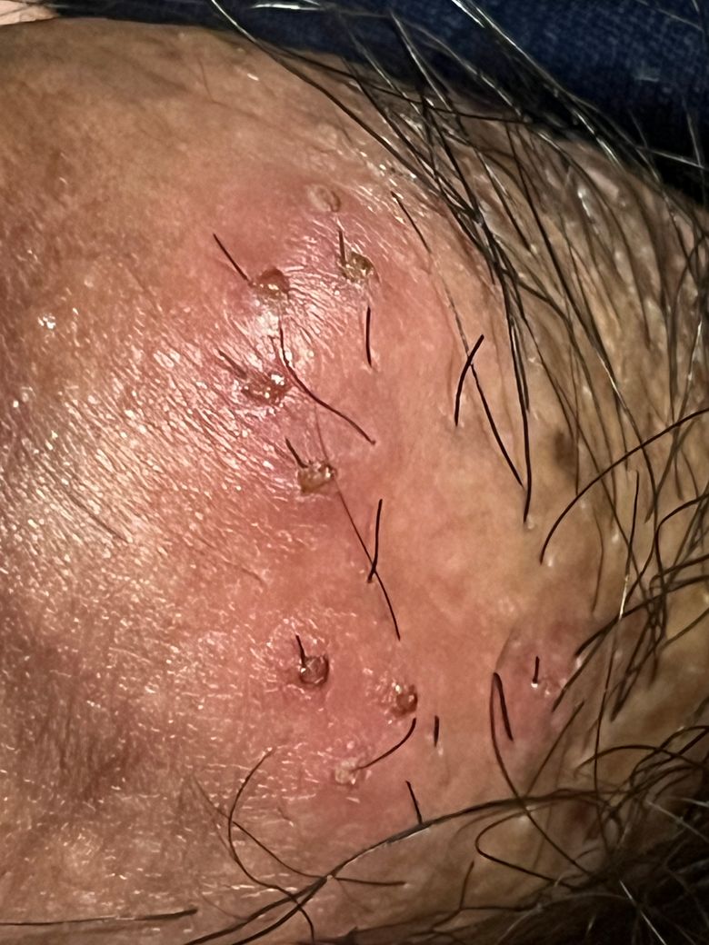 4일전 여자친구와 관계하다가 고추 뿌리부분이 좀 쓸려서 따가운느낌이들었는데 그다음날 좀 따갑더니2일뒤부터 털이난모낭 쪽만 이렇게 염증이났어요 생활하다 털이 땡겨지면 너무아파서 염증부위만털을깍아놨습니다 모낭염인가요 헤르페스인가오ㅜ