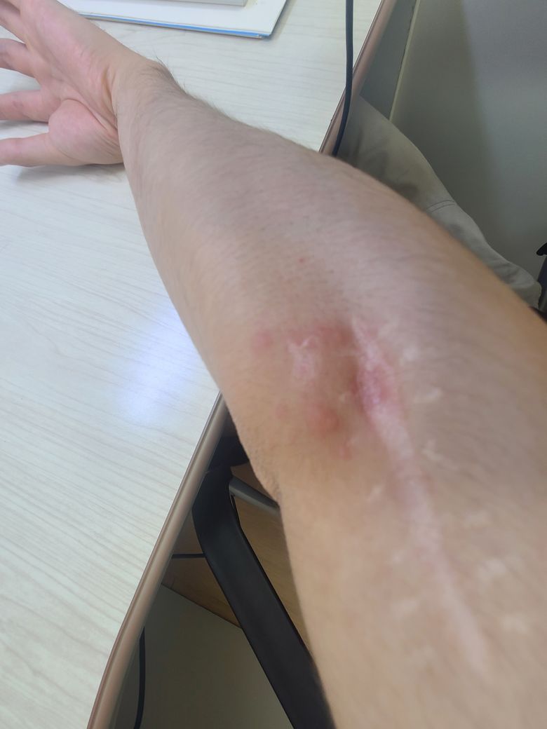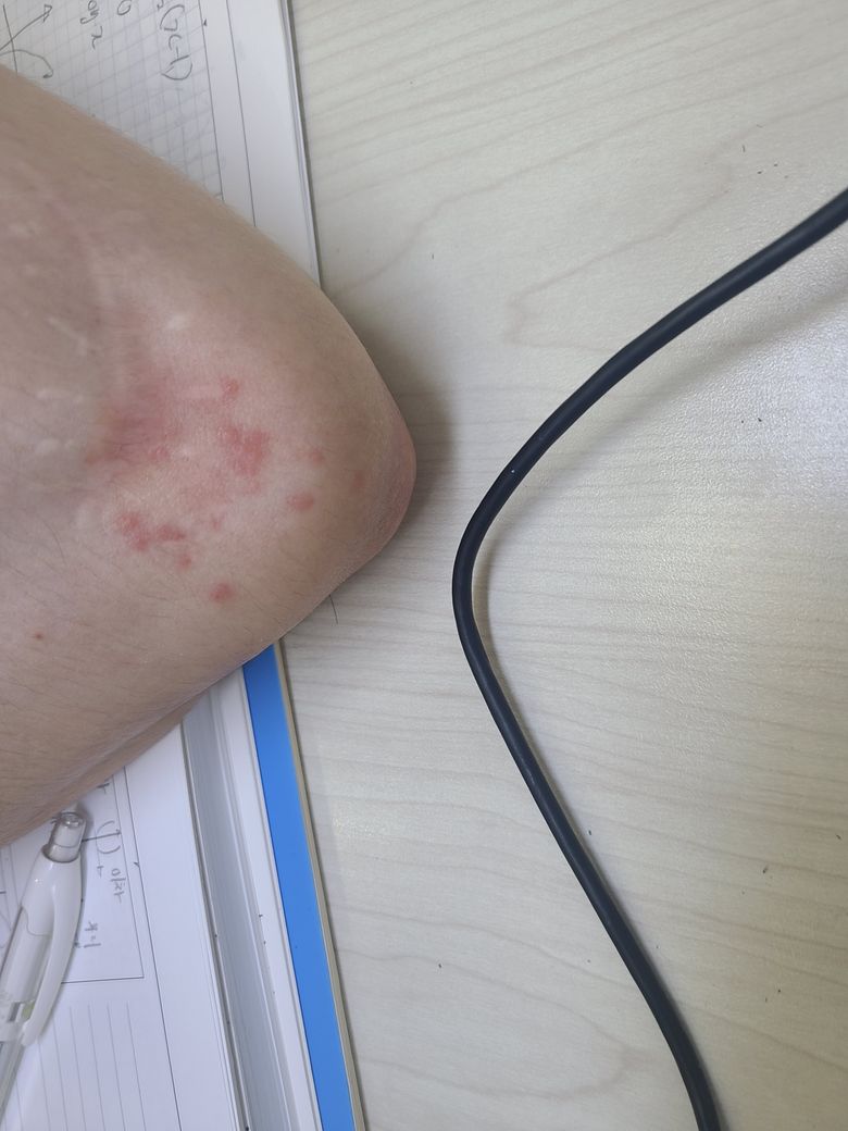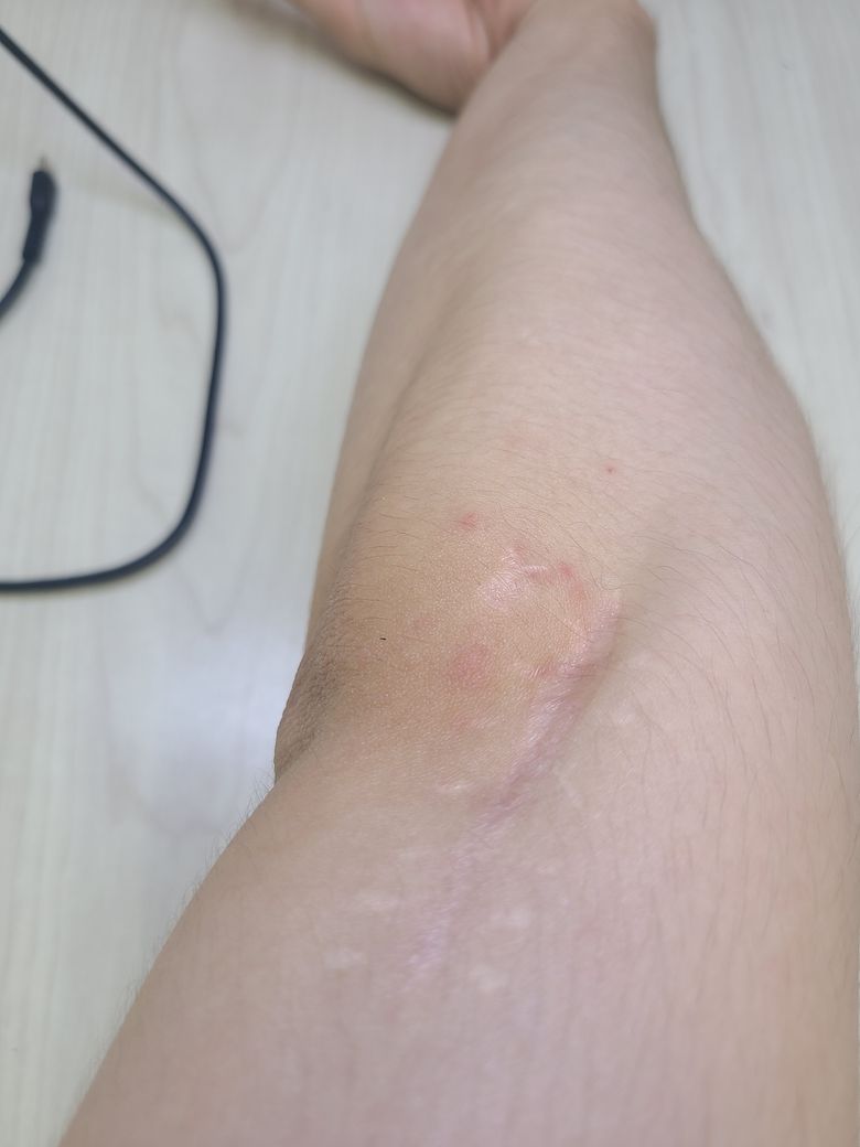 그리고 다음날 이런 자국이 생겼는데, 모기와 다르게 호전되지 않고 계속 꾸준히 가려워서 당일에 피부과에 갔습니다.