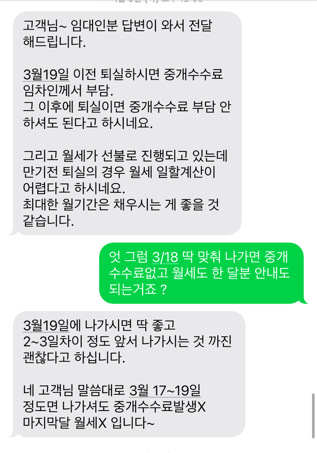 분명 3/18 딱 맞춰 퇴실하면 중개수수료도 없고 월세 한 달분도 안내도되냐고 물어봤고