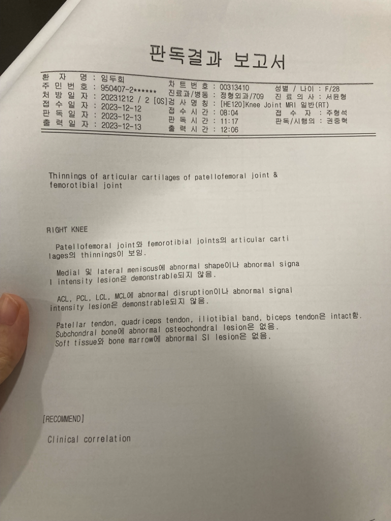 오른쪽 Femoropatellar joint 연골이 thinning 즉 얇아져 있다는 것으로