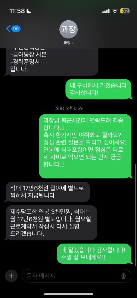 제가 면접때 들은 바로는 식대포함 연봉3천이라고 하셨었는데 제가 혹시 몰라 문자로 다시 물어보니 이러한 내용을 받았습니다