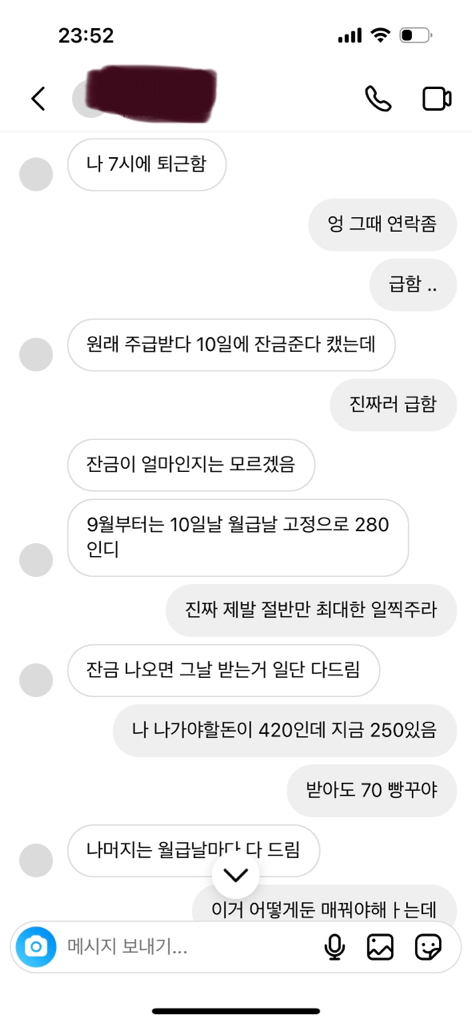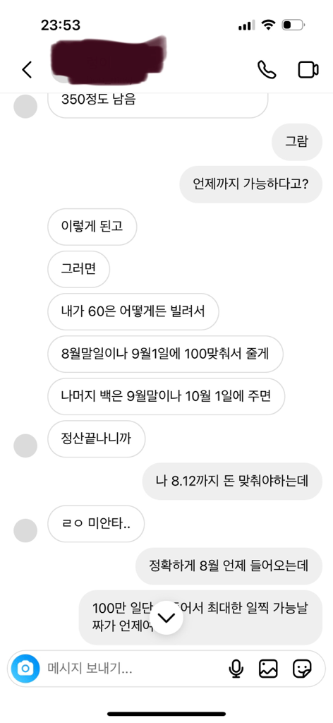 그 친구는 두달정도만에 캐디 교육기간 과정을 포기하고 다른일을 하러 갔고 이번달 8월 31일 말까지 100만원(늦어도 9월1일), 10월1일까지 나머지 100만원을 두달에 거쳐서 주기로 했는데, 일주일전에 sns차단, 카카오톡 차단, 전화번호까지 바꿨드라구요. 증거자료라고는 제가 메모장에 써놓은 장부와 최근에 인스타그램 dm으로 한 내용이 다입니다. (첨부)