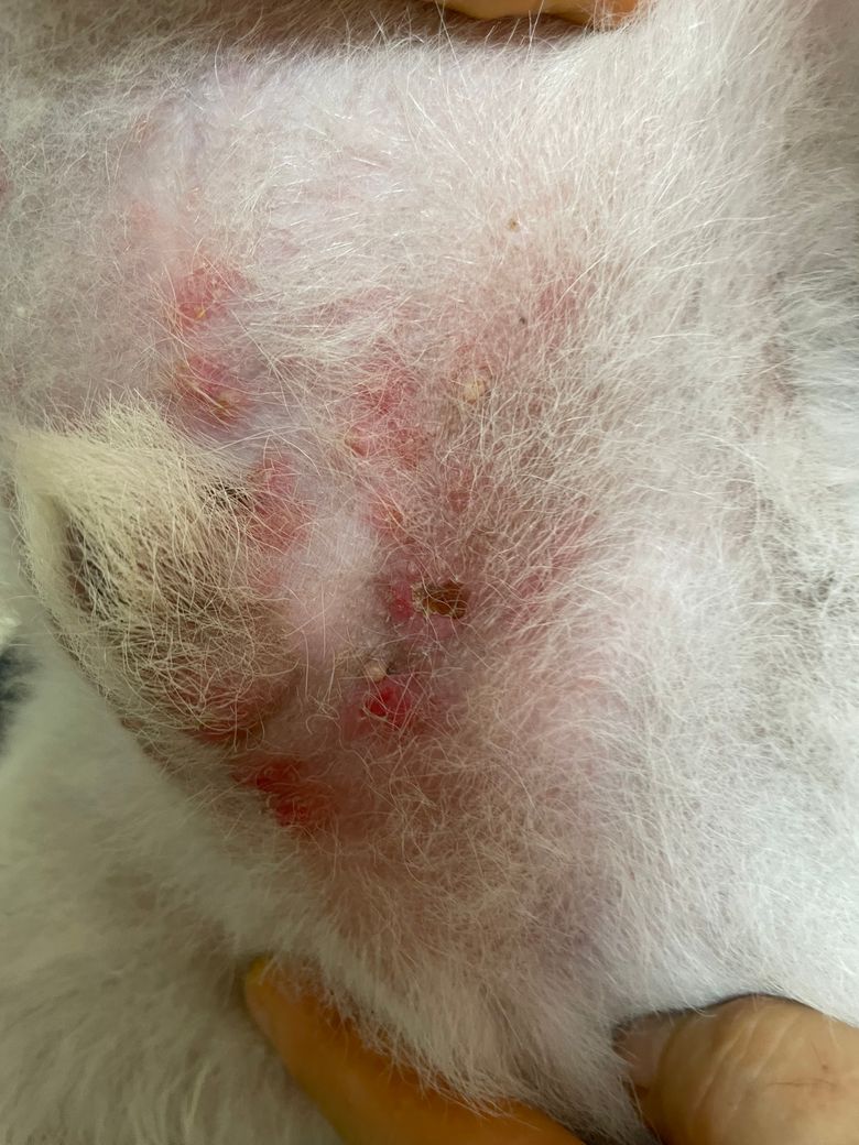 예, 진작 병원에 갔어야 하는 상태로 보입니다. 상당히 심각한 수준의 농피증 양상을 보이고 있어 전신적 이상 가능성도 같이 고려되어야 하는 상태입니다.