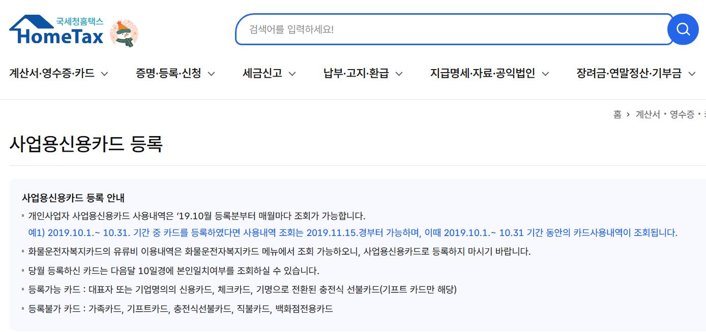 홈텍스 사업자 카드등록 적용일 문의드립니다