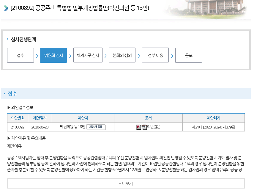 공공임대 특별법 개정안 박진의원이 발의한 법안 현재 진행사항을 알수있나요?