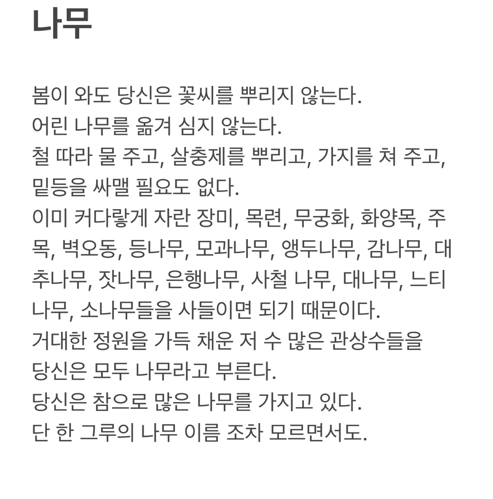 당신은 참 많은 나무를 가지고있다 - 이 부분에서 다른 사람이 나를 보는 관점으로 본다면 나무를 하나의 아름다움 등으로 이해되며 많은 재능, 감정, 감각, 장점 등을 가지고 있는 것으로 해석됩니다.