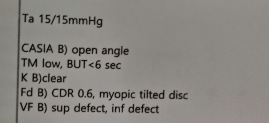 안저사진은 양안 모두 유두함몰비 0.6 (0.6 이상부터 녹내장 의심합니다), 근시로 인해 disc 모양이 tilted 되어 있다는 뜻입니다.