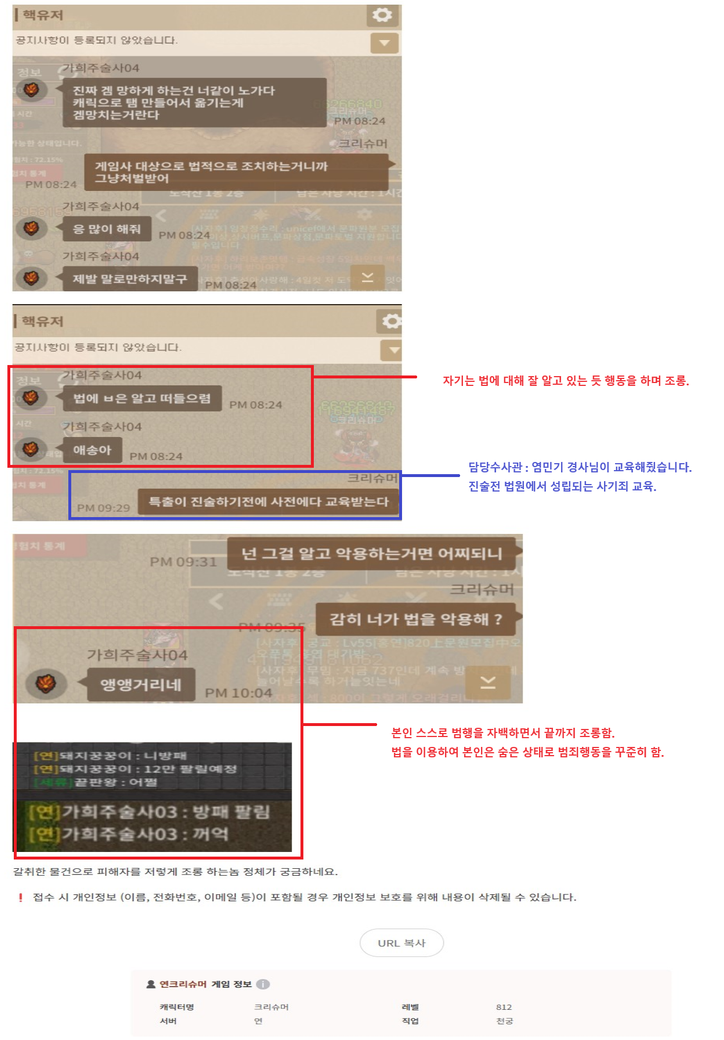 - 현금 거래가 아닌 법을 악용한 게임 내 범죄 수법, 갈취한 물건으로 다음날 게임 내 오픈 채팅방에서 조롱 및 명예훼손