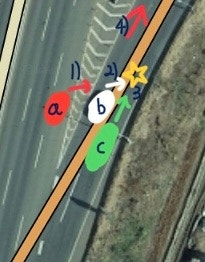 1) 가해차량 'a'(승용차) 는 분기점 금지선을 넘어서 분기점에 끼어드려 하였습니다. 여기서 'b' 차량(승용차) 옆 1m이하로 가까이 붙었습니다.