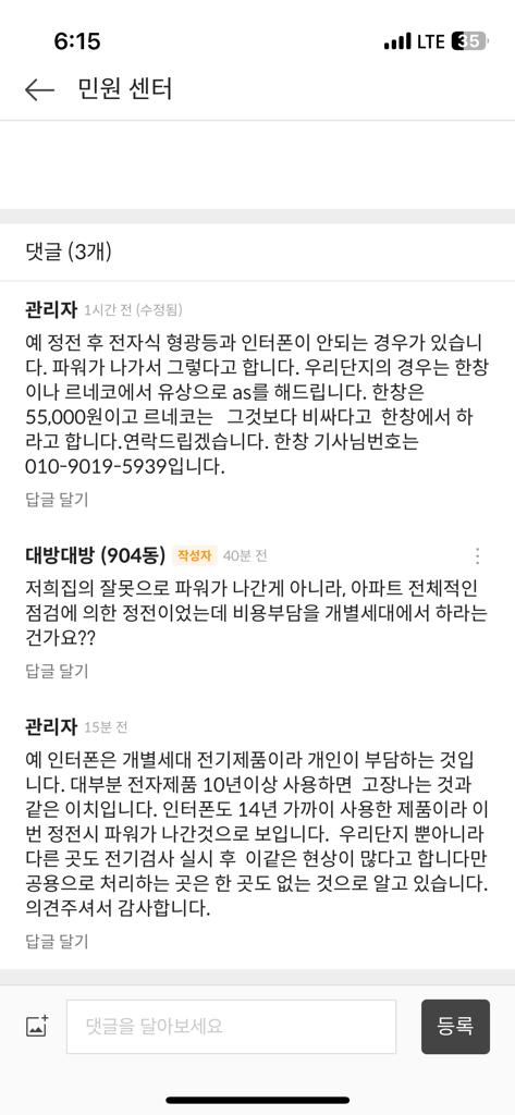 노후화 아파트에 세대내에 방문하여 전기안전검사를 할 시 차단기(두꺼비집)도 내리고 인터폰도 끕니다. 이 때 관리소 직원이 노후화 아파트라고 인지하고 있다면 입주민에게 먼저 인터폰을 끄고 차단기를 내렸다가 올리면 다시 전원이 안 들어 올 수 있으니 그 추후 수리 비용은 입주민이 부담해야한다고 고지를 하는 것이 좋습니다.