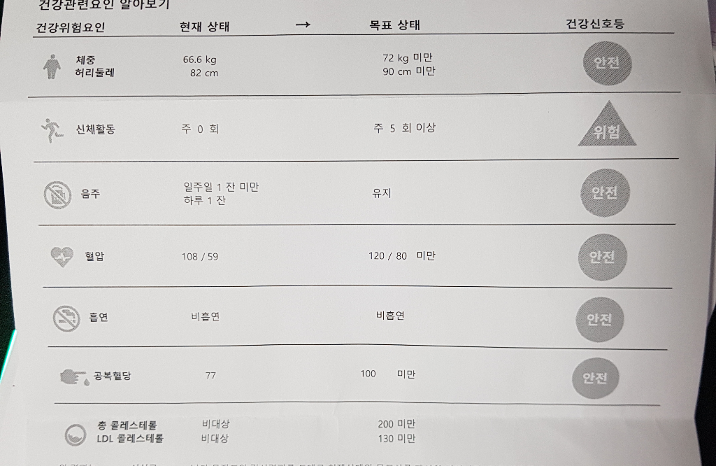 결과를 종합적으로 보았을 때, 전반적으로 건강한 편으로 판단됩니다. 그러나 건강은 단순히 '질병이 없다'는 것만을 의미하는 것이 아니며, 지속적인 관리와 노력이 필요합니다. 특히 근력운동을 포함한 꾸준한 운동은 신체 건강은 물론, 스트레스 관리와 심리적 안정에도 큰 도움이 됩니다.