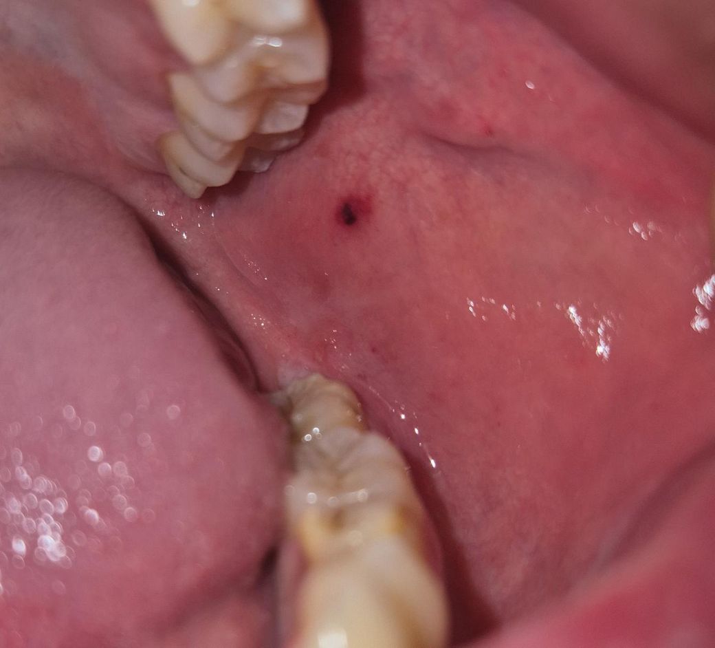 입 안 쪽에 점상 출혈이 발생한 것으로 입 안 역시 피부와 같이