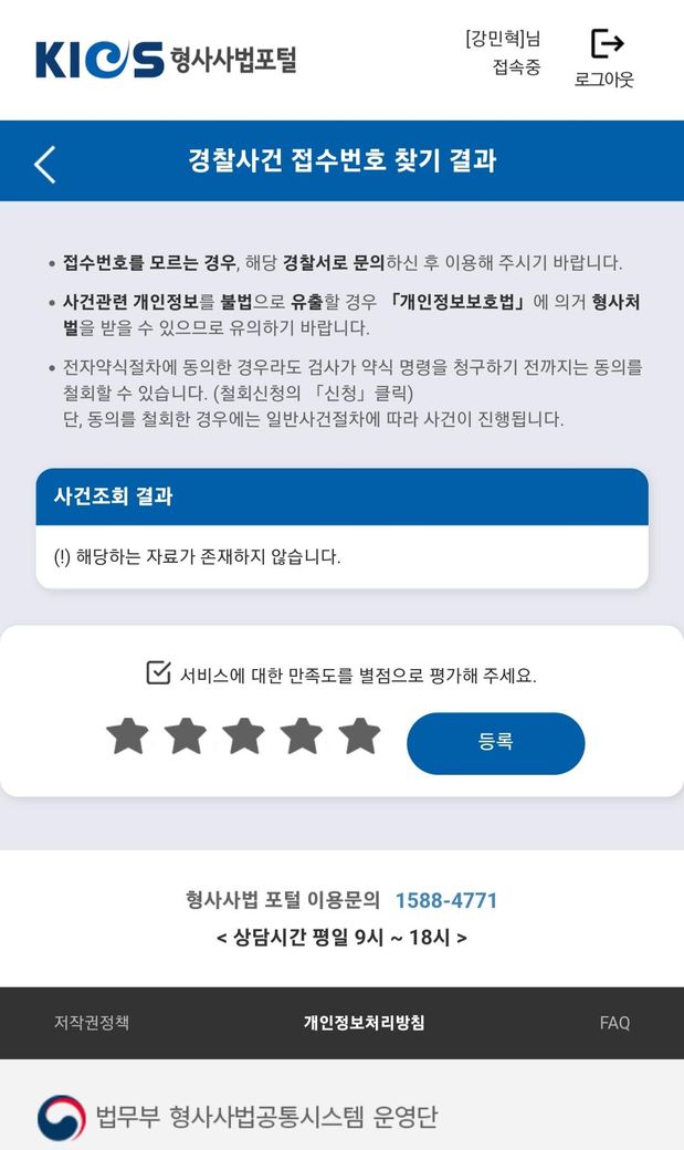 누군가 절 고소한걸로 착각(?)하여 형사사법포털에 들어가 경찰사건 조회를 했습니다.