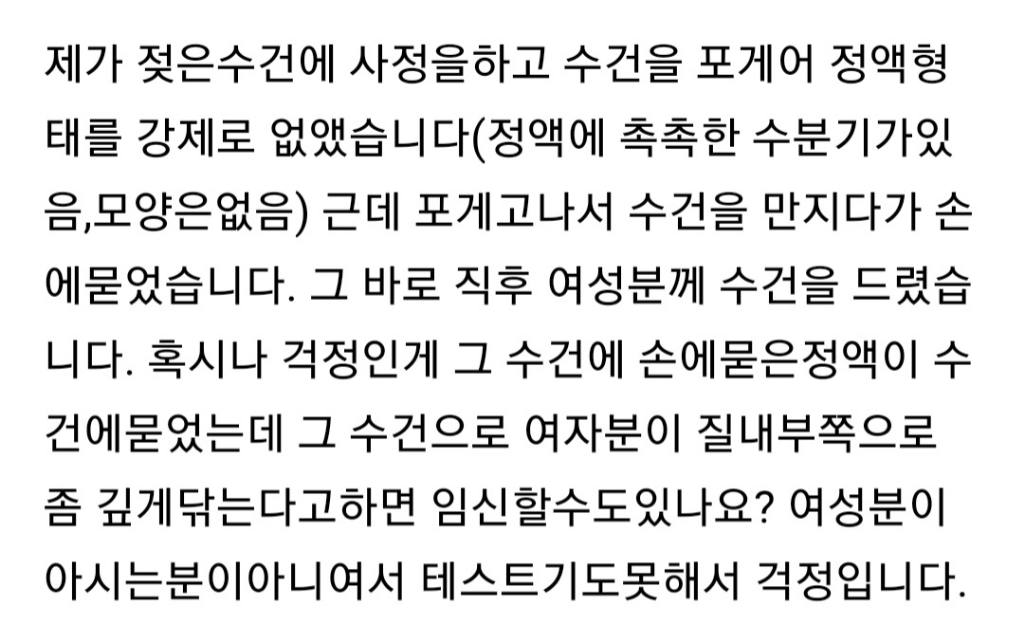 정자이 질 외부에서는 1시간 정도 밖에는 생존하지 못합니다. 손에 묻은 정도의 정자로는 임신 가능성이 매우 낮습니다. 양이 적으니깐요. 정자가 눈에 보이지도 않을 정도로 작은데 질 입구에서 아무리 깊게 수건으로 닦아도 자궁 경부까지도 못 갑니다. 정자 입장에서는 거의 걸어서 저하늘까지 가는 거리입니다. 안될 만한 가능성이 3가지 상황입니다. 만약 지금 상황이 임신이 가능하다면 한강에 사정을 하고 그 물로 샤워한 여성이 임신이 되면 가능할 겁니다.