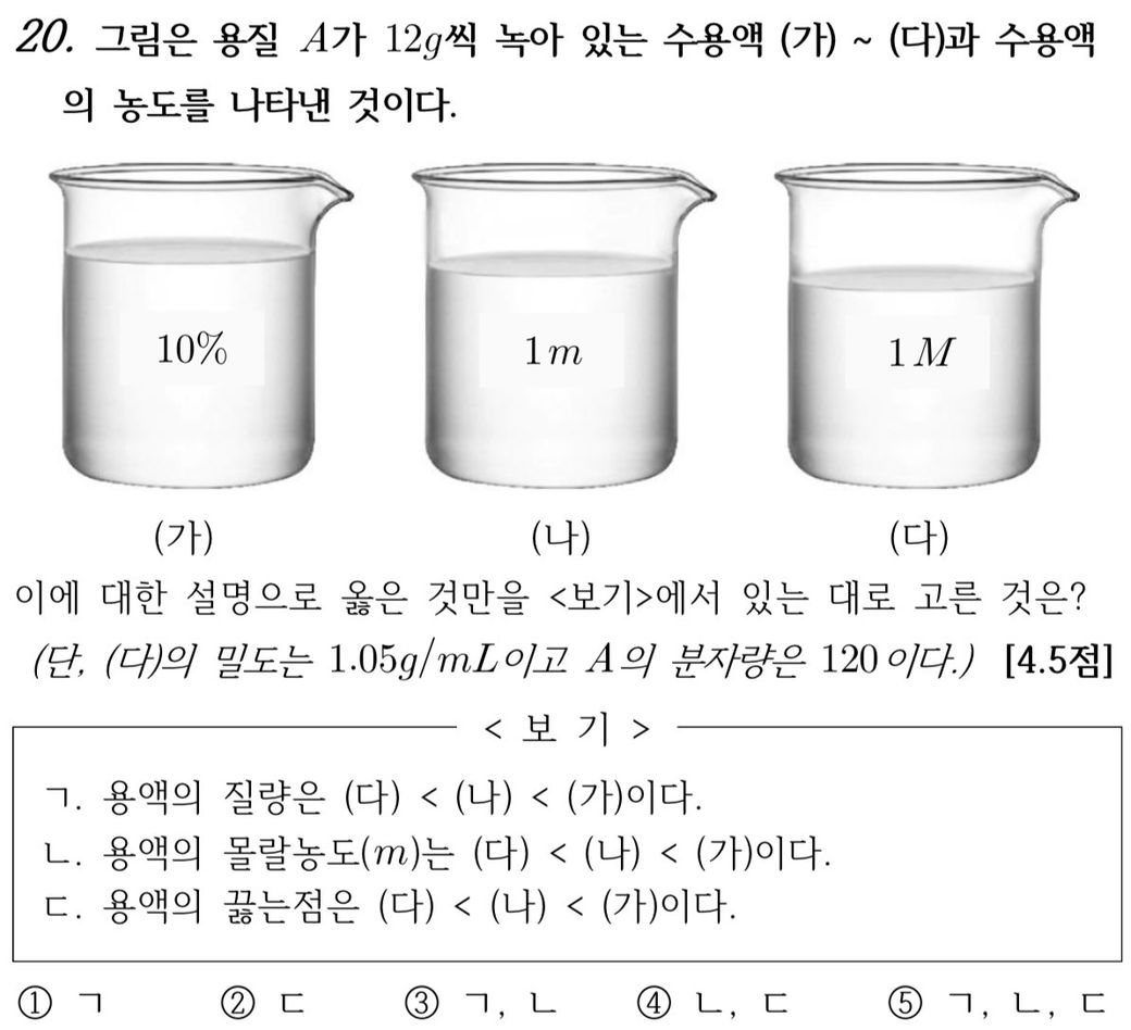 질문하신 화학2 문제는 용액의 세 가지 농도 단위(퍼센트 농도, 몰랄 농도, 몰농도)를 비교하고 이를 통해서 이해하는 아주 좋은 문제 유형이니, 천천히 풀이 내용을 익혀보면서 이해에 도움이 되기를 바랄게요.