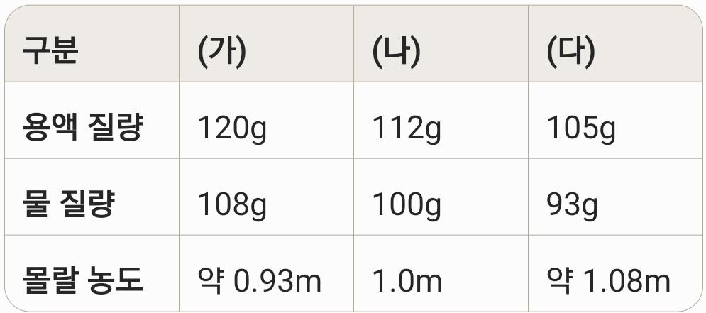 물(용매)의 양 비교: (가) 108g > (나) 100g > (다) 93g