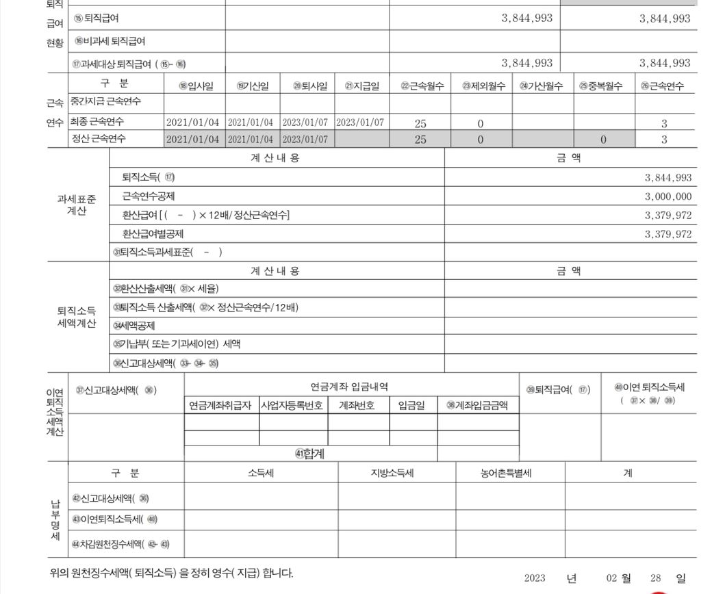 이에따른 퇴직금원천징수영수증을 회신받았는데 영수증상 기재된 퇴직소득은 380만원이오나 환산급여공제에서 330만원이 찍혀있고 실수령도 330만원으로 들어왔습니다. 또한, 1월 초 퇴사 의사를 밝혔고 사직서에 기재한 퇴직일은 1월 30일이오나 퇴직원천징수영수증 상 퇴직일은 1월 7일로 되어있습니다. 여기서 몇가지 질문드립니다.