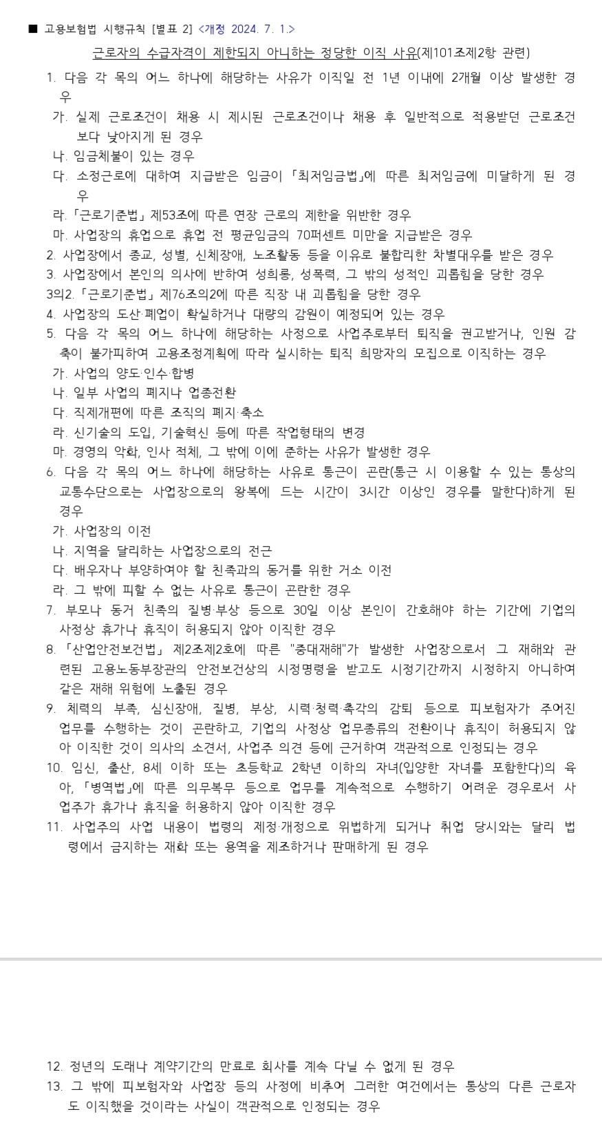 상기 사유는 고용보험법 제101조제2항 별표2에서 정하는 구직급여 수급자격이 인정되는 정당한 이직사유에 해당하지 않으므로 자발적 이직 시 구직급여 수급자격이 제한됩니다. 다만, 연장수당 미지급의 경우, 3할 이상이 체불된 때에는 그 기간이 2개월 이상 지속된 경우 정당한 이직사유로 인정하며, 3할 미만이 체불되었지만, 그 기간이 6개월 이상 지속된 때에는 통상의 다른 근로자도 이직했을 것이라고 보고 정당한 이직사유로 인정합니다.