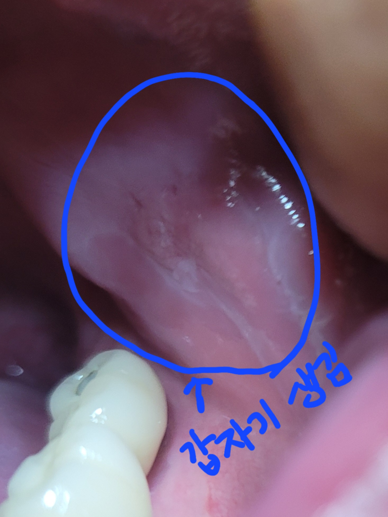 해당부위에 생기는 흰색 물질은 구강내 상피조직이 탈락되면서 생기는 현상입니다.