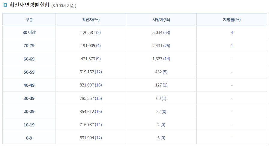 코로나 사망자의 각각 연령대 퍼센트는 얼마나 되나요?