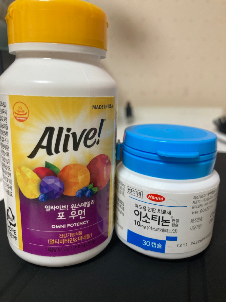 이소티논을 복용중일때는 비타민A의 추가섭취는 부작용위험을 높이기때문에 얼라이브는 드시면 안됩니다.