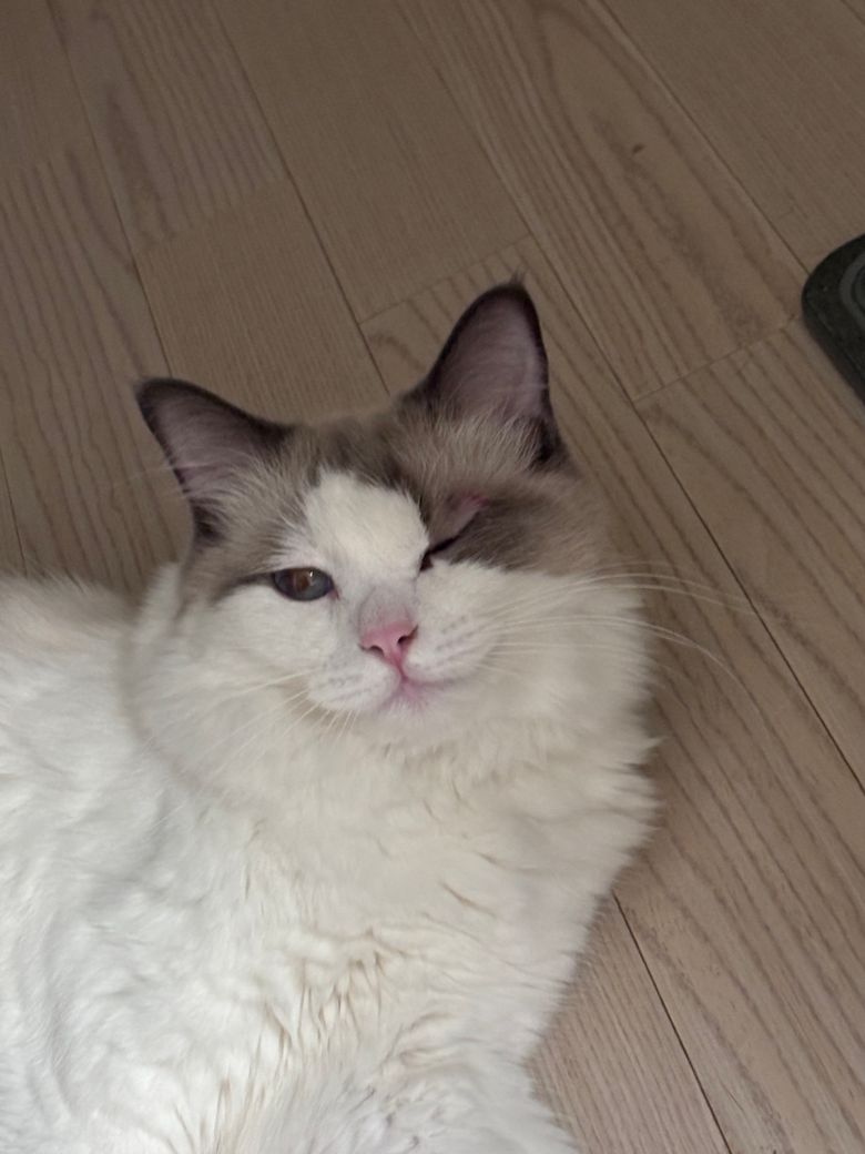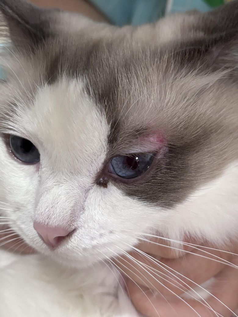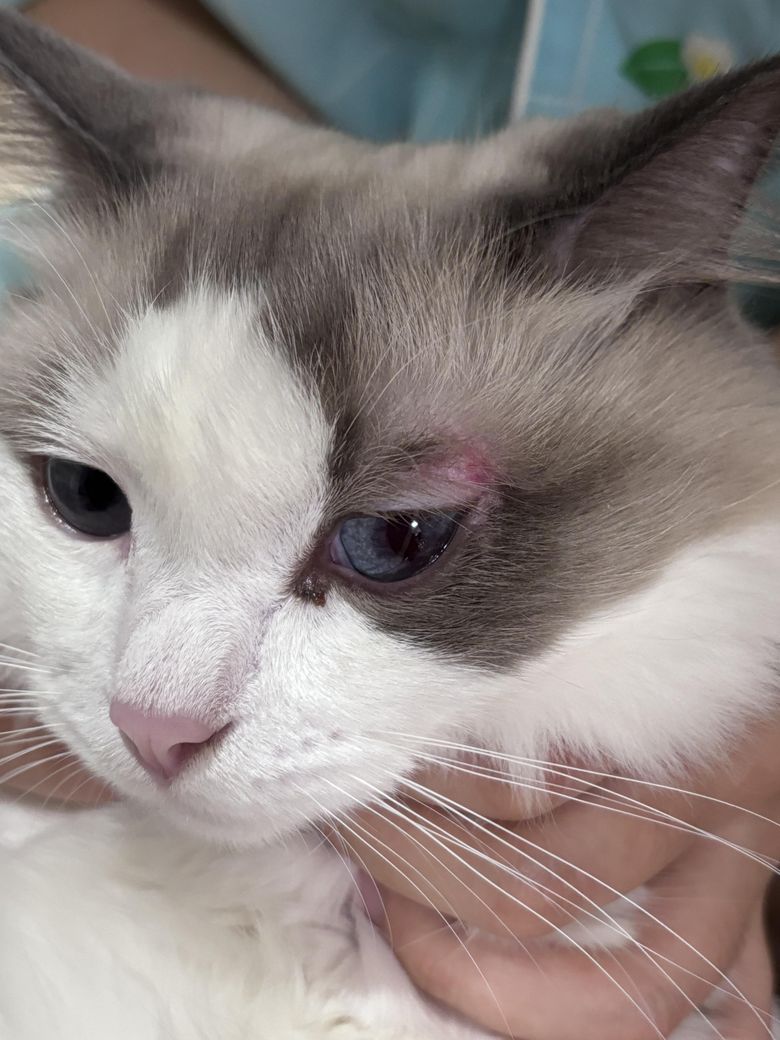 오늘 갑자기 고양이 눈 위 피부에 빨갛게 뭐가 올라와서 보니까 사진처럼 되어 있어서요… 처음에는 그렇게 간지러워하진 않았는데 동물용 소독약으로 소독해주니 그 후 좀 간지러워합니다ㅠ 혹시 링웜은 아니겠죠ㅠㅠ