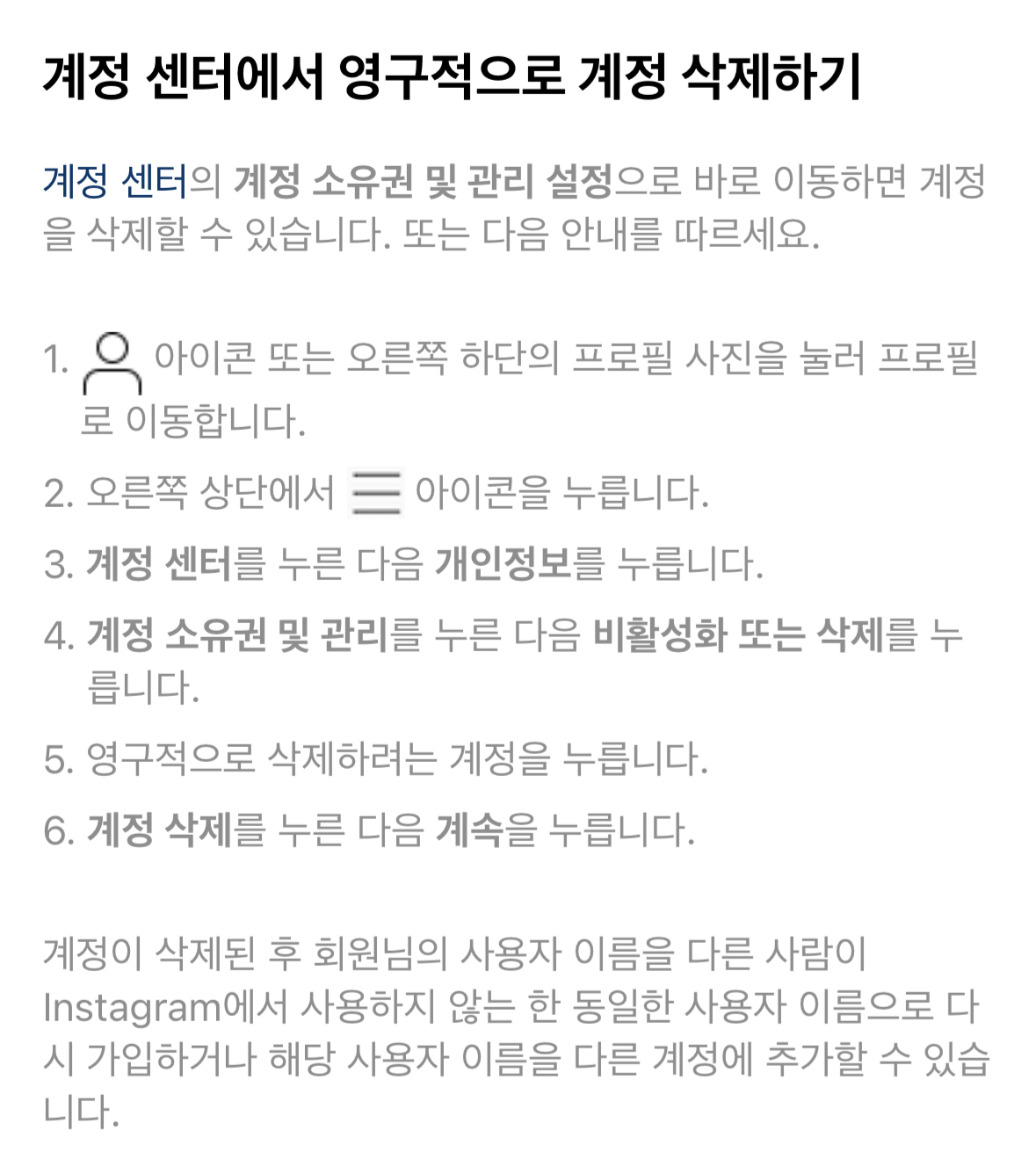 인스타그램 계정이 페이스북과 연동된 상태에서 페이스북 계정을 탈퇴하면 인스타그램 계정 삭제가 어려워질 수 있습니다.