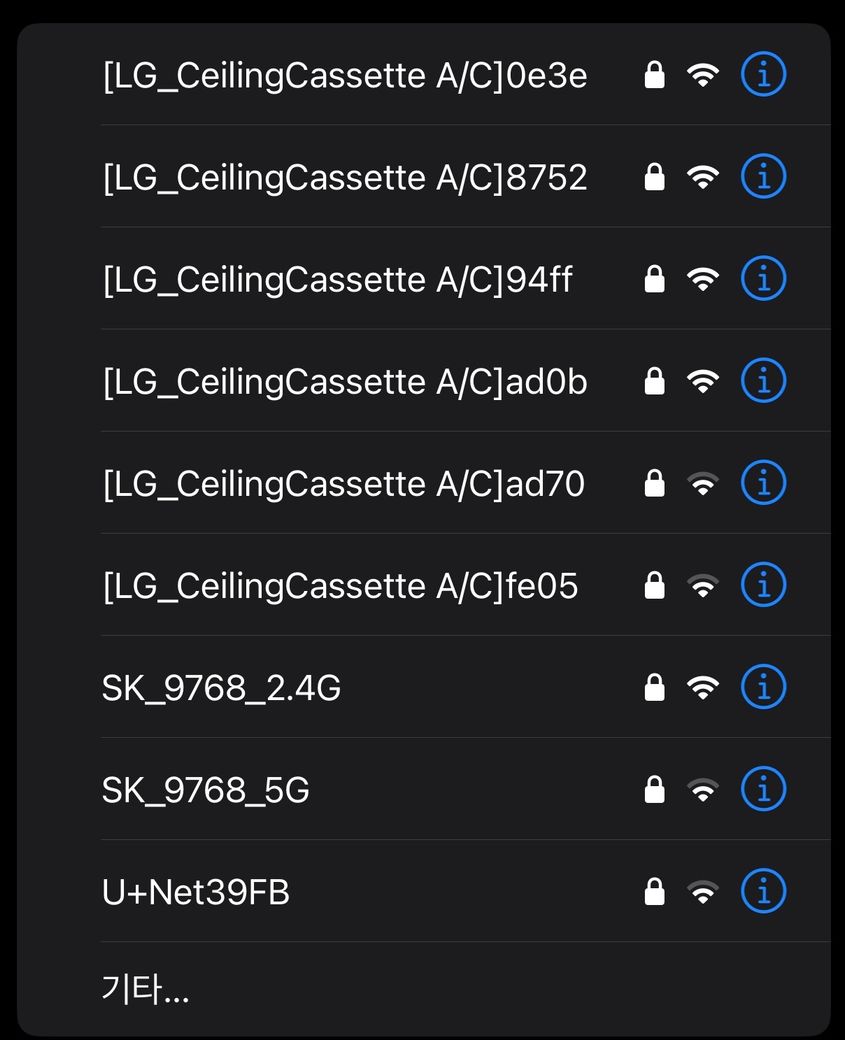 이제 제가 사진 보니깐 천장에 설치된 LG 시스템에어컨이 있는데 이런 천장형에어컨이 각 실내기마다 와이파이 신호를 따로 보내는 구조입니다