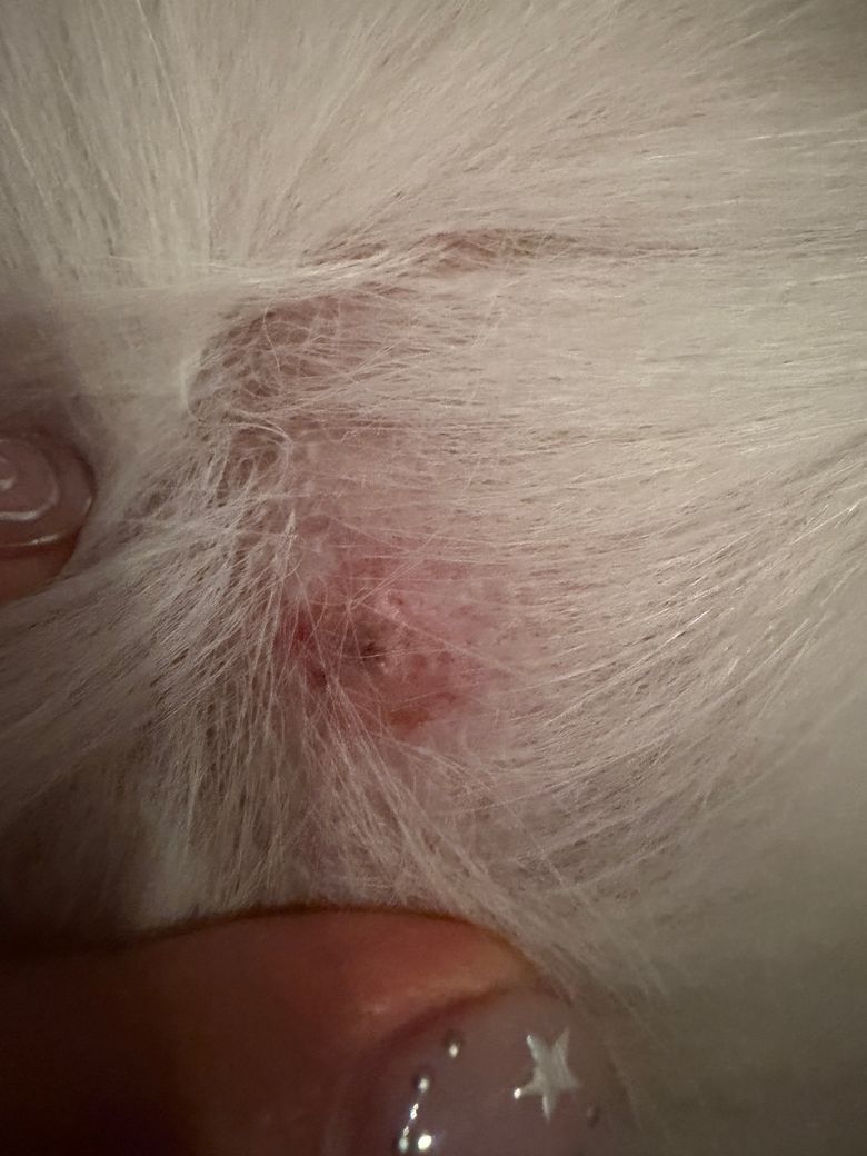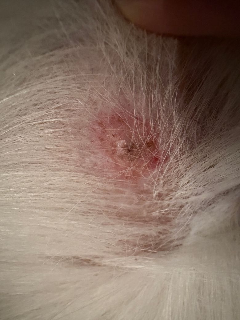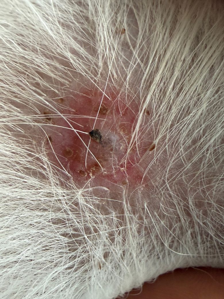 몇일전에 강아지 가슴쪽에서 발견된 상처인데 진드기에 물린 상처 일까요? 진드기는 발견 되지 않았어요.